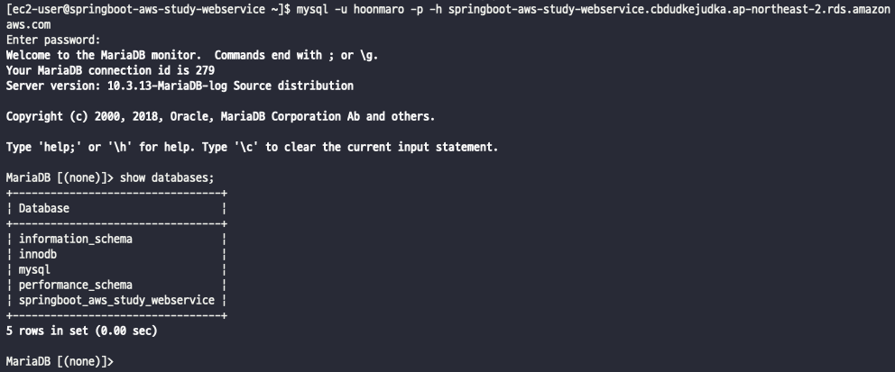 $ mysql -u hoonmaro -p -h springboot-aws-study-webservice.cbdudkejudka.ap-northeast-2.rds.amazonaws.com