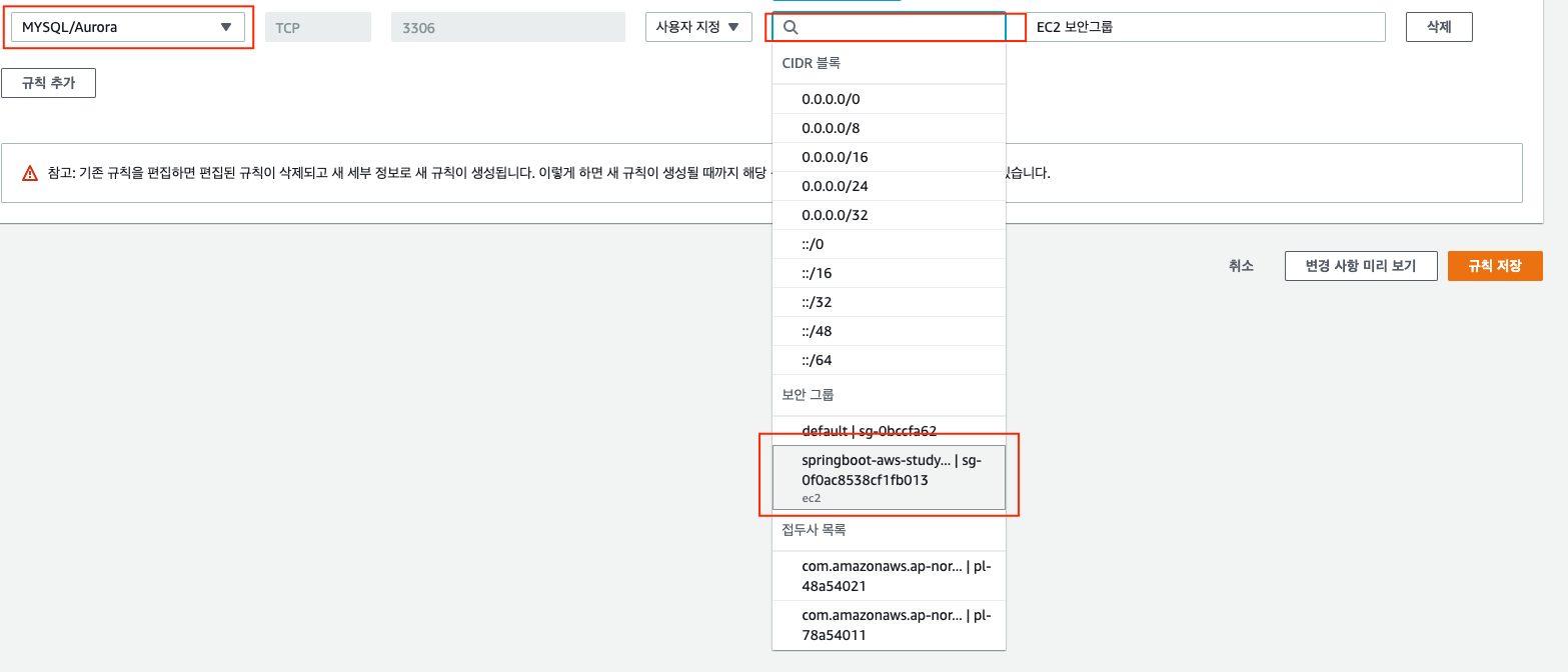 규칙 추가버튼을 클릭하여 생성된 라인에서MYSQL/Auora를 선택한다.- 사용자 지정 목록에서 웹서비스용 EC2의 보안 그룹을 선택한다.