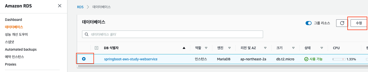 - RDS > DB 인스턴스 목록에서 DB를 선택 후 상세페이지의