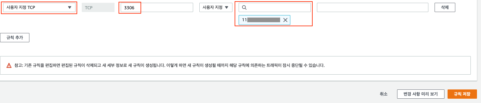 규칙 추가버튼을 클릭하여 생성된 라인에서사용자 지정 TCP를 선택한다. 3306포트를 입력한다.사용자 지정 유형으로 본인 IP를 입력한다. 드롭다운에서본인IP/32보여지고 선택하면 그림처럼 세팅된다.- 마지막으로