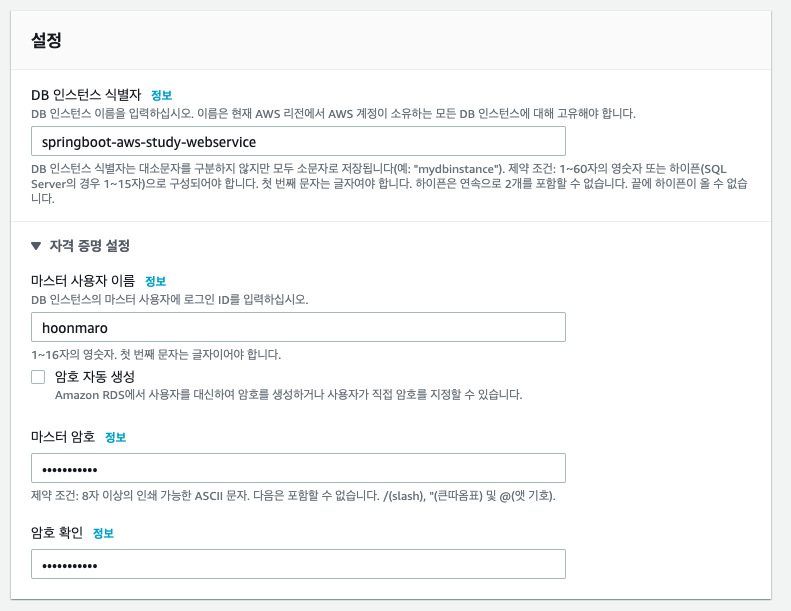 - DB 마스터 사용자 이름과 비밀번호를 입력한다.