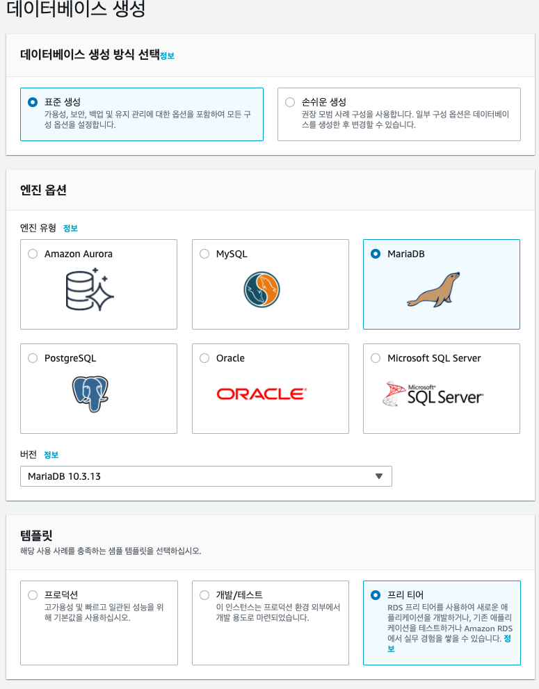 - MariaDB 엔진과 프리티어 템플릿을 선택한다.