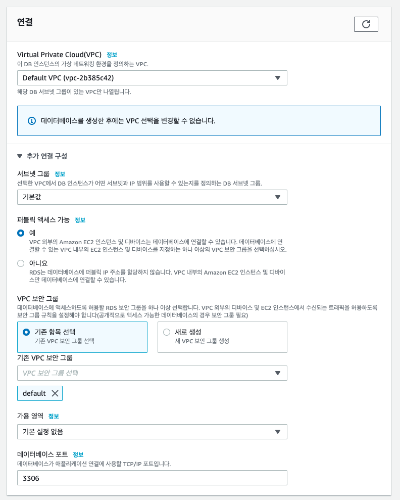 - RDS 생성시 타임존, Character Set, Max Connection 설정을 해줘야 한다.
